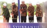 RS Syubbanul Wathon. (Dari kiri) Pengasuh Pondok Pesantren Syubbanul Wathon KH Yusuf Choudiri, Sekjen PBNU Helmy Faishal Zaini, Sekda Pemprov Jateng Sri Puryono, Chairman Lippo Group Mochtar Riady, Ketua PBNU Bidang Pendidikan M Nuh, melakukan Topping Off RSU Syubbanul Wathon di Tegalrejo, Magelang, Jawa Tengah, Selasa (20/3). (FOTO : Republika/Yogi Ardhi)
