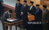 Ketua Fraksi PDIP Utut Adianto menandatangani berita acara disaksikan Ketua Mahkamah Agung Hatta Ali, Ketua DPR Bambang Soesatyo, Wakil Ketua DPR Fahri Hamzah, Agus Hermanto, Fadli Zon dan Taufik Kurniawan saat pelantikan Wakil Ketua DPR sisa masa jabatan 2014-2019 pada Sidang Paripurna DPR RI di Kompleks Parlemen, Senayan, Jakarta, Selasa (20/3). (FOTO : Republika/Prayogi)