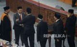 Wakil Ketua DPR Utut Adianto menerima ucapan selamat dari Ketua Mahkamah Agung Hatta Ali, Ketua DPR Bambang Soesatyo, Wakil Ketua DPR Agus Hermanto, Fadli Zon dan Taufik Kurniawan usai pelantikan Wakil Ketua DPR sisa masa jabatan 2014-2019 pada Sidang Paripurna DPR RI di Kompleks Parlemen, Senayan, Jakarta, Selasa (20/3). (FOTO : Republika/Prayogi)