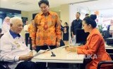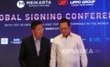 CEO Lippo Group, James Riady (kiri) berbincang dengan Ketua DPR RI, Bambang Soesatyo sebelum menyaksikan acara penandatanganan mou Meikarta dengan sembilan institusi ternama di dunia dalam bidang pendidikan, kesehatan dan teknologi di Jakarta, Rabu (21/3). (FOTO : Darmawan / Republika)