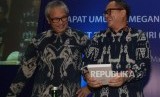 Komisaris Utama Bank Mandiri Hartadi A Sarwono (kiri) berbincang dengan Direktur Utama Bank Mandiri Kartika Wirjoatmodjo sebelum pelaksanaan Rapat Umum Pemegang Saham Tahunan (RUPST) 2017 di Jakarta, Rabu (21/3). (FOTO : Republika/Prayogi)