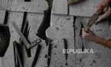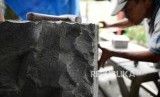 Bejo 63 tahun memahat balok batu dengan gaya relief di sentra kerajinan batu Linang Sayang Muntilan, Kabupaten Magelang, Jawa Tengah, Senin (19/3). (FOTO : Republika/Yogi Ardhi)