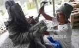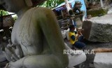 Pemahat batu di sentra kerajinan batu Linang Sayang mebuat patung dewa perang umat konghucu dengan bahan baku batu granit berukuran besar sebelum dipahat di Muntilan, Kabupaten Magelang, Jawa Tengah, Senin (19/3). (FOTO : Republika/Yogi Ardhi)