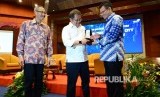 Menteri Komunikasi dan Informatika RI Rudiantara (tengah) menerima cenderamata dari Ketua Serikat Karyawan Telkom Asep Mulyana (kanan) disaksikan Direktur Wholesale and International Service Telkom Abdus Somad Arief (kiri) di Jakarta, Kamis (22/3). (FOTO : Puspa Perwitasari/Antara)