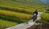 Warga melintas di jalan beton yang dibangun diantara bentangan sawah, dari program dana Desa di Kiarajangkung, Kabupaten Tasikmalaya, Jawa Barat, Kamis (22/3). Pemerintah mengalokasi anggaran Dana Desa sebesar Rp60 triliun yang masing-masing setiap desa mendapatkan Rp3,5 miliar, (FOTO : Adeng Bustomi/Antara)