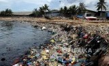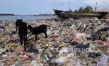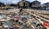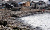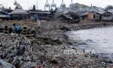 Sampah yang berasal dari aliran air laut tersebut telah menumpuk hingga menjadi daratan sampah yang bisa dilalui dengan berjalan kaki oleh warga setempat.