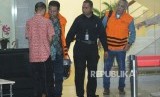 Anggota DPRD Kota Malang periode 2014-2019, Abd. Rachman ( kedua kiri) Hery Subiantono(kanan) mengenakan rompi orange paska diperiksa di Komisi Pemberantasan Korupsi, Jakarta, Selasa (27/3). (FOTO : Republika/Iman Firmansyah)