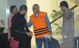 Walikota Malang Periode 2013-2018, Moch Anton mengenakan rompi orange berada di mobil tahanan paska diperiksa di Komisi Pemberantasan Korupsi, Jakarta, Selasa (27/3). (FOTO : Republika/Iman Firmansyah)