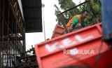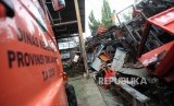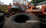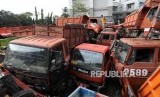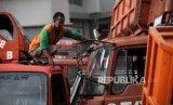 Petugas melakukan pengecekan bangkai kendaraan truk sampah di Kantor Suku Dinas Lingkungan Hidup, Jakarta, Selasa (27/3). (FOTO : Republika/Mahmud Muhyidin)