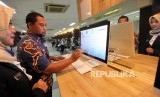 Suasana saat petugas memandu warga mengisi form pendaftaran untuk membayar pajak kendaraan dengan menggunakan Samsat Digital e-Samsat di Kantor Bersama Pelayanan Satu Atap Polda Metro Jaya, Jakarta, Rabu (28/3). (FOTO : Republika/Mahmud Muhyidin)