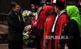 Wakil Presiden Jusuf Kalla menyalami (kiri) Ketua Mahkamah Konstitusi (MK) Terpilih Anwar Usman (kedua kiri) usai mengucap sumpah jabatan di Gedung MK, Jakarta, Senin (2/4). (FOTO : Republika/Putra M. Akbar)