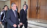 Penetapan Gubernur Bank Indonesia. Gubernur BI terpilih Perry Warjiyo (kiri) dan Deputi Gubernur BI terpilih Dody Budi Waluyo ( kanan) saat tiba di gedung Rapat Paripurna di Komplek Parlemen Senayan, Jakarta, Selasa (3/4). (FOTO : Republika/ Wihdan)