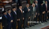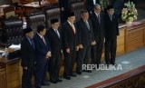 Penetapan Gubernur Bank Indonesia. Ketua DPR Bambang Soesatyo (keempat kiri) didampingi empat Wakil Ketua DPR memperkenalkan Gubernur BI terpilih Perry Warjiyo (kelima kiri) dan Deputi Gubernur BI terpilih Dody Budi Waluyo (keenam kanan) serta pejabat lama Gubernur Bank indonesia Agus Martowardojo (tengah) saat Rapat Paripurna di Komplek Parlemen Senayan, Jakarta, Selasa (3/4). (FOTO : Republika/ Wihdan)