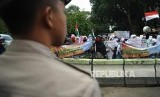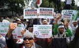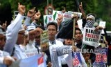 Ratusan peserta aksi damai yang tergabung dari Al- Aqsa Working Group melakukan aksi damai di depan kantor Kedubes Amerika Serikat di Jakarta, Selasa (3/4). (FOTO : Republika/Iman Firmansyah)