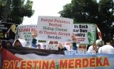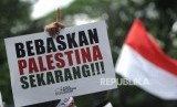 Poster bertuliska 'Bebaskan Palestina Sekarang' saat aksi damai di depan kantor Kedubes Amerika Serikat di Jakarta, Selasa (3/4) (FOTO : Republika/Iman Firmansyah)