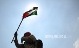 Peserta aksi damai yang tergabung dari Al- Aqsa Working Group mengibarkan bendera Palestina saat melakukan aksi damai di depan kantor Kedubes Amerika Serikat di Jakarta, Selasa (3/4). (FOTO : Republika/Iman Firmansyah)