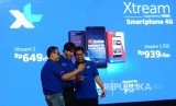 Head Mass Segment Acuisition XL Axiata Junius Khoestadi, Chief Marketing Officer XL Axiata, David Arcelus Oses dan Director Evercoss Akwila Natanael, berfoto pada sesi peluncuran smartphone 4G pertama //Xtream// dengan di Jakarta. Jumat (6/4). (FOTO : Yogi Ardhi/Republika)