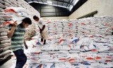 Sejumlah pekerja menumpuk karung berisi beras di Gudang Bulog Subdivre Serang, di Serang, Banten, Jumat (6/4). Menjelang Ramadan, stok beras di Gudang Bulog Serang mencapai 5.900 ton untuk tingkat konsumsi normal akan bisa mencukupi kebutuhan selama 7 bulan ke depan, dan akan ditambah lagi dengan hasil panen raya sepanjang bulan April-Juni mendatang. (FOTO : Asep Fathulrahman/Anbtara)