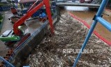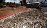 REPUBLIKA.CO.ID, JAKARTA -- Petugas Dinas Lingkungan Hidup Pemprov DKI Jakarta mengangkut sampah yang menumpuk di Pintu Air Manggarai, Jakarta, Ahad (8/4).