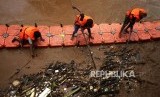 Petugas Dinas Lingkungan Hidup Pemprov DKI Jakarta mengangkut sampah yang menumpuk di Pintu Air Manggarai, Jakarta, Ahad (8/4). (FOTO : Republika/Mahmud Muhyidin)