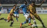 Striker Persib Ezechiel Ndouasel (kedua kanan) berebut bola dengan pesepak bola Mitra Kukar Mauricio Maciel Leal (kanan) saat laga lanjutan Liga 1 di Bandung, Jawa Barat. Minggu (8/4). (FOTO : Novrian Arbi/Antara)
