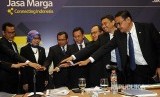 Direktur Utama PT Jasa Marga (Persero) Tbk Desi Arryani (kedua kanan), Komisaris Utama Refly Harun (kiri), berfoto bersama jajaran direksi usai Rapat Umum Pemegang Saham Tahunan, di Jakarta, Selasa (10/4). Perusahaan operator jalan tol milik negara Jasa Marga membagikan dividen tunai 20% dari laba bersih periode 2017 (FOTO : Audy Alwi/Antara)