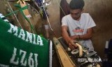 Pekerja menyelesaikan produksi syal di industri rumahan, Kampung Nangoh, Desa Panembong, Bayongbong, Kabupaten Garut, Jawa Barat, Selasa (10/4). Sebanyak 80 persen warga kampung tersebut menjadi produsen kerajinan rajut dan setiap bulan industri rumahan dapat memproduksi rata-rata 700 kodi dengan harga Rp450 ribu per kodi yang dijual ke seluruh wilayah Indonesia. (FOTO : Agvi Firdaus/Antara)