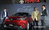 Presiden Direktur PT Toyota-Astra Motor (TAM) Yoshihiro Nakata (kanan), Wakil Presiden Direktur TAM Henry Tanoto (kiri) dan Product Representative New C-HR Maruli Tampubolon (tengah) berfoto di depan Toyota New-CHR yang diluncurkan, di Jakarta, Rabu (10/4). (FOTO : Audy Alwi/Antara)