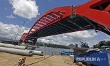 Pekerja menyelesaikan pembangunan jembatan Holtekamp, di Jayapura, Papua, Rabu (11/4). Jembatan yang dikerjakan Kementrian Pekerjaan Umum dan Perumahan Rakyat (PUPR) tersebut rencananya mulai bisa dipergunakan pada Juli 2018. (FOTO : Yulius Satria Wijaya/Antara)