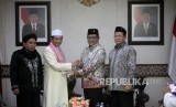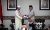 Sekjen PDI Perjuangan Hasto Kristiyanto (kanan) menyerahkan buku kepada Iman Besar Masjid Istiqlal Nasaruddin Umar (kiri) saat bersilaturahmi di Masjid Iqtiqlal, Jakarta, Rabu (11/4). (FOTO : Republika/Mahmud Muhyidin)