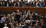 CEO Facebook Mark Zuckerberg dikerumuni wartawan saat tiba di Capitol Hill, Washington, Rabu (11/4), AS. Senat AS memanggil Zuckerberg atas kasus penggunaan data Facebook yang menyasar pemilih American pada pemilu 2016 dan privasi data. (FOTO : Michael Reynolds/EPA)