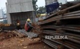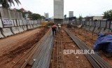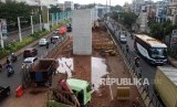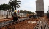 Pekerja menyelesaikan pembangunan proyek Tol Cimanggis-Cibitung di Kawasan Alternatif Cibubur, Jakarta, Kamis (12/4). (FOTO : Republika/Mahmud Muhyidin)
