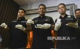 REPUBLIKA.CO.ID, JAKARTA -- Tersangka dihadirkan saat pemberian keterangan pers tentang pengembangan kasus penggunaan narkoba di Polda Metro Jaya, Jakarta, Ahad (15/4).