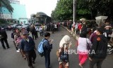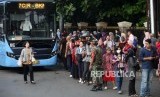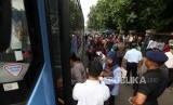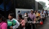 REPUBLIKA.CO.ID, JAKARTA -- Sejumlah warga mengantre di Halte Transjakarta kawasan Cibubur, Jakarta Timur, Senin (16/4).