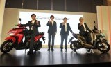 President Director PT Astra Honda Motor (AHM) Toshiyuki Inuma (kanan), Executive Vice President Johannes Loman (kiri) dan para Marketing Director Shigeto Kimura (kedua kiri) dan Thomas Wijaya memperkenalkan All New Honda Vario 150 dan All New Honda Vario 125 di Jakarta, Senin (16/4). (FOTO : Republika/Edwin Dwi Putranto)