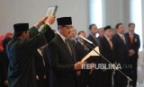 Pelantikan Deputi Gubernur BI. Deputi Gubernur Bank Indonesia Dody Budi Waluyo membaca sumpah jabatan saat pelantikan Deputi Gubernur BI di Mahkamah Agung, Jakarta, Rabu (18/4). (FOTO : Republika/ Wihdan)