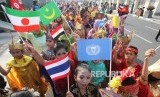 Dalam rangka memperingati HUT Konferensi Asia Afrika (KAA) ke-63, ratusan anak-anak berpakaian tradisional nusantara membawa bendera peserta KAA, di depan Gedung Merdeka, Jalan Asia Afrika Kota Bandung, Rabu (18/4). (FOTO : Republika/Edi Yusuf)