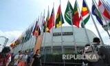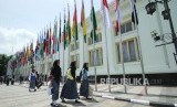 Memperingati HUT Konferensi Asia Afrika (KAA) ke-63, berdera peserta Konferensi Asia Afrika dipasang di halaman Gedung Merdeka, Kota Bandung, Rabu (18/4). (FOTO : Republika/Edi Yusuf)