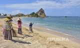 Sejumlah pekerja membersihkan pantai dekat area pembangunan Paramount Hotel & Residences di Kawasan Mandalika yang dikelola dan dikembangkan oleh BUMN Indonesia Tourism Development Corporation (ITDC) di Mandalika, Desa Kuta, Kecamatan Pujut, Praya, Lombok Tengah, NTB, Rabu (18/4). (FOTO : Ahmad Subaidi/Antara)