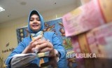 Seorang karyawan menghitung uang nasabah di bank bjb cabang Surabaya di sela-sela peresmian gedung tersebut, Surabaya, Jawa Timur, Selasa (17/4). Kehadiran bank bjb cabang Surabaya itu diharapkan dapat meningkatkan kualitas layanan serta mewujudkan kepedulian bank bjb terhadap pemberian pelayanan, kemudahan dan kenyamanan. (FOTO : Zabur Karuru/Antara)