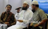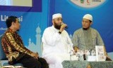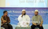 Penulis Internasional asal Mesir Syaikh Mahmud Al Mishri (tengah) memaparkan pendapatnya pada acara Jumpa Penulis Internasional di Jakarta Convention Center (JCC), Jakarta, Kamis (19/4). (FOTO : Republika/Putra M. Akbar)