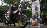 Presdir PT Multistrada Arah Sarana Tbk Pieter Tanuri (kiri) bersama pemilik Lawless Gofar Hilman menaiki motor custom saat peluncuran ban motor baru Corsa Cross S Dual Purpose di Jakarta, Selasa (24/4). PT Multistrada Arah Sarana Tbk (MASA) memperkenalkan ban motor baru Corsa Cross S Dual Purpose. (FOTO : Republika/Edwin Dwi Putranto)