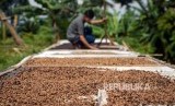 Petani mengeringkan biji kopi arabika di Desa Sindanglaya, Kabupaten Bandung, Jawa Barat, Selasa (24/4). Data dari International Coffee Organization (ICO), pertumbuhan rata-rata ekspor kopi di Indonesia per tahun sebesar lima hingga enam persen, atau setara 15.000 hingga 16.000 ton. (FOTO : Raisan Al Farisi/Antara)