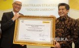 Presiden Direktur PT Bank Maybank Indonesia Tbk (Maybank Indonesia) Taswin Zakaria (kanan) dan Ketua Umum Asosiasi Penyelenggara Haji Umrah dan In-Bound Indonesia (Asphurindo) Syam Resfiadi menunjukkan piagam kerja sama yang telah ditandatangani bersama tentang kemitraan strategis Maybank Indonesia dengan Asphurindo di Jakarta, Selasa (24/4). (FOTO : Audy Alwi/Antara)
