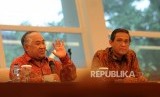 Utusan Khusus Presiden RI Untuk Dialog dan Kerja Sama Antar Agama dan Peradaban (UKP-DKAAP) Din Syamsuddin dan Dirjen Informasi dan Diplomasi Publik Cecep Herawan (dari kiri) memberikan paparan pada konferensi pers terkait penyelenggaraan High Level Consultation of World Muslim Scholars On Wasatiyyat Islam (HLC-WMS) di Kementerian Luar Negeri, Jakarta, Rabu (25/4). (FOTO : Republika/Putra M. Akbar)