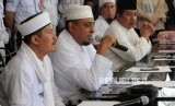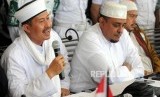 Ketua Tim 11 Alumni 212 Misbahul Anam bersama Anggota Tim 11 Alumni 212 Yusuf Muhammad Marta dan Slamet Maarif (dari kiri) memberikan paparan saat melakukan konferensi pers di kawasan Tebet, Jakarta, Rabu (25/4). (FOTO : Republika/Putra M. Akbar)