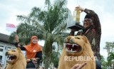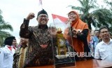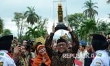 Gubernur Jawa Barat Ahmad Heryawan didampingi istri mengangkat penghargaan Parasamya Purnakarya Nugraha dari Presiden Republik Indonesia atas prestasi kinerja tertinggi secara nasional, di depan Gedung Sate, Kota Bandung, Kamis (26/4). (FOTO : Republika/Edi Yusuf)