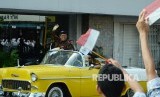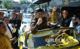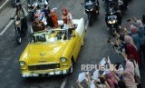 Gubernur Jawa Barat Ahmad Heryawan disambut masyarakat saat konvoi dari Stasiun Bandung menuju Gedung Sate membawa penghargaan Parasamya Purnakarya Nugraha dari Presiden Republik Indonesia atas prestasi kinerja tertinggi secara nasional, Kamis (26/4). (FOTO : Republika/Edi Yusuf)