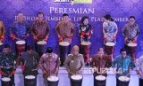 Bupati Jember Hj. Farida MMR (keempat kiri bawah), Chairman Lippo Grup Mochtar Riady (kedua kanan bawah), CEO Lippo Grup James Riady (ketiga kiri atas), Wakil Direktur Siloam Hospitals Group Caroline Riady (kedua kanan atas) dan Ibu Suryawaty Lidya (ketiga kanan atas) serta jajaran dan tokoh masyarakat setempat memukul jimbei sebagai tanda peresmian Jember Icon yang terdiri dari Rumah Sakit Siloam dan Lippo Plaza Jember, Kamis (26/4). (FOTO : Darmawan/Republika)