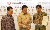 Direktur Trivo Orion Properti Ian Wisan, Dirut Trivo Orion Properti Robert Yapari dan Dir CFO Daiwa House Properti Tubagus Nauval Haedar (dari kiri) menunjukkan draft perjanjian kerjasama di Jakarta, Kamis (26/4). Kerjasama meliputi pembangunan kawasan hunian terpadu Sakura Garden City, membuat sekitar 5000 tempat tinggal di Jakarta Timur. (FOTO : Tahta Aidilla/Republika)